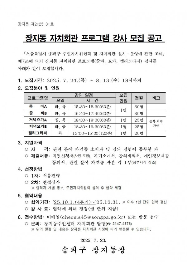 - 본 게시물은 장지동주민자치위원회 에서 제공한 자료로 개인정보를 포함하고 있으며 임의유포, 수집, 배포가 금지됩니다.